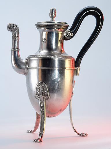 Keywords: Silver. Kaffekanna- Coffee pot - Hallwylska museet - 82133.tif Invändigt förgylld Äggformad med upptill indraget liv på tre ben med tassfötter och palmettbeslag bladbård fyra pålagda rosetter och pärlstav; lock med godronnering och ollonformad knopp samt pip avslutad av ett hundhuvud Skaft av svärtad björk - - Gilt interior Oviform body incurved at the top on three legs with paw feet and palmette mounts foliated border four applied rosettes with beading gadrooned lid with acorn-shaped finial spout with a dogs terminal Handle of black -stained birch <br/><br/>Gåva till Wilhelmina von Hallwyl julaftonen 1899 från hennes dotter Ebba von Eckermann och kammarherren Wilhelm von Eckermann original caption Silver Kaffekanna/ Coffee pot XLII I F a 04 1823 size cm 21 8 HWY place of origin Stockholm SE original filename hm_t09246 16424 inventory number HWY XLII I F a 04 82133 CC-BY-SA <gallery caption Different images of same object > File Silver Kaffekanna- Coffee pot - Hallwylska museet - 5087 tif </gallery> Silver in the Hallwyl museum Media contributed by LSH unmatched creator Media contributed by LSH 2013-10 |