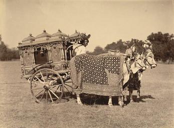 | Keywords: Silver Zenana carriage at Baroda in the 1890s.jpg en Photograph of a silver zenana carriage at Baroda Gujarat from the Curzon Collection taken by an unknown photographer during the 1890s The enclosed carriage ensured the seclusion of female members of the royal household when travelling The confinement of Indian women within the family home or behind a veil was known as purdah and zenana was the name given to segregated women ™s quarters The lavishly decorated two-wheeled carriage is drawn by caparisoned bullocks and belonged to Gaekwar Sayaji Rao III ruled 1875-1939 12th Maharaja of Baroda He owned a collection of exotic transport which also included golden carriages and a miniature carriage drawn by deer s 1890 http //www oldindianphotos in/2010_07_05_archive html author other versions Custom license marker 2014 11 26 PD-100 Vadodara in the 1890s Uploaded with UploadWizard Ox-drawn carts in India British Library Photo 430 Curzon Collection |