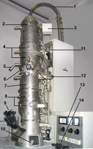 | Keywords: Simens numeri.jpg  en Siemens electron microscope 1969 it Microscopio elettronico Siemens 1969 Own Ricce 2008-08-19 LEGENDA 1-cavo dell'alta tensione;2-emissione di elettroni; 3-motori di centraggio del raggio; 4-condensatori; 5-regolazione dei diaframmi; 6-portacampione; 7-obiettivo; 8-proiettori; 9-microscopio ottico stereoscopico; 10-schermo fluorescente; 11-tubi del sistema per produrre il vuoto; 12-spostapreparati; 13-controllo del vuoto ed ingrandimenti; 14-manopole di messa a fuoco English Translation High tension cable Electron emitter Stepper motors for centering the electron beam Condenser Aperture controls Specimen holder Objective lens Projector lens Optical binoculars Fluorescent screen Vacuum pump leads Goniometer- Vacuum and magnification control Focusing control Transmission electron microscope Vacuum tools Siemens |
