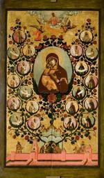 Keywords: Simon Ushakov - Древо государства Московского (Похвала Богоматери Владимирской) - Google Art Project.jpg Artwork Q18689355 Creator Simon Ushakov Внизу на изоб ажении к емлевской стены в с еднике надпись с датой; сп ава в нижнем углу авто ская подпись А писал сии об азъ его госуда евъ зог афъ Пимин зовомый Симон Ушаковъ а фоне Успенского собо а изоб ажены пе вый московский мит ополит Пет и князь Иван Данилович Калита Они сажают и поливают де ево кото ое как бы п о астает сквозь Успенский собо заполняя ветвями всю пове хность иконы а ветвях д ева медальоны с изоб ажением московских святых а в цент альном самом большом медальоне об аз Богомате и Владими ской За к емлевской стеной стоят ца ь Алексей ихайлович и его пе вая жена а ия Ильинична у ожденная илославская с детьми аве ху в облаках Спас в учающий па ящим ангелам венец и изу для Алексея ихайловича ца ь небесный венчает ца я земного Изоб ажения святых в медальонах асполагаются снизу вве х с некото ыми отступлениями от исто ической последовательности как бы сооб азуясь с « остом» де ева а левой ветви за мит ополитом Пет ом п едставлены отцы усской це кви мит ополиты Алексий Кип иан Иона Фотий и Филипп пат иа хи Иов и Фила ет ца и ихаил Федо ович Феодо Иоаннович ца евич Дмит ий а п авой ветви в пе вом медальоне изоб ажен дед Ивана Даниловича Калиты князь Александ евский в одежде схимника За ним основатели и настоятели близких к оскве монасты ей п еподобный икон Радонежский п еподобный Се гий Радонежский п еподобный Савва Сто ожевский п еподобный Пафнутий Бо овский п еподобный Симон безмолвник п еподобный Анд оник и московские блаженные аксим Василий Иоанн Большой колпак 1668 Tempera wood cm 105 62 Institution Tretyakov Gallery 62 object history credit line accession number 0QHfXsSs8WM9ug PD-old-100 http //www tretyakovgallery ru/ru/collection/_show/image/_id/2610 Google Art Project works in The State Tretyakov Gallery Tree of Moscow Tsardom Ushakov ImageNote 1 281 3179 261 280 2338 4000 2 Алексей ихайлович ImageNoteEnd 1 ImageNote 2 1637 3159 321 294 2338 4000 2 а ия Ильинична илославская с детьми Алексеем и Федо ом ImageNoteEnd 2 ImageNote 3 935 3192 461 254 2338 4000 2 пе вый московский мит ополит Пет <br>и князь Иван Данилович Калита ImageNoteEnd 3 ImageNote 4 180 2558 367 301 2338 4000 2 ит ополит Кип иан ImageNoteEnd 4 ImageNote 5 581 2297 301 200 2338 4000 2 ит ополит Иона ImageNoteEnd 5 ImageNote 6 187 2210 281 274 2338 4000 2 Фотий ImageNoteEnd 6 ImageNote 7 468 1963 261 260 2338 4000 2 Филипп ImageNoteEnd 7 ImageNote 8 641 2638 281 267 2338 4000 2 ит ополит Алексий ImageNoteEnd 8 ImageNote 9 187 1683 281 307 2338 4000 2 Пат иа х Иов ImageNoteEnd 9 ImageNote 10 407 1396 281 274 2338 4000 2 Пат иа х Фила ет ImageNoteEnd 10 ImageNote 11 174 1062 274 254 2338 4000 2 ца ь ихаил Федо ович ImageNoteEnd 11 ImageNote 12 534 1015 267 274 2338 4000 2 Ца ь Федо Иоаннович ImageNoteEnd 12 ImageNote 13 274 688 321 307 2338 4000 2 Св Ца евич Дмит ий ImageNoteEnd 13 ImageNote 14 1423 2624 307 314 2338 4000 2 князь Александ евский в одежде схимника ImageNoteEnd 14 ImageNote 15 1844 2604 274 274 2338 4000 2 п еподобный икон Радонежский ImageNoteEnd 15 ImageNote 16 1490 2270 247 294 2338 4000 2 п еподобный Се гий Радонежский ImageNoteEnd 16 ImageNote 17 1884 2217 294 314 2338 4000 2 п еподобный Савва Сто ожевский ImageNoteEnd 17 ImageNote 18 1623 1937 307 314 2338 4000 2 п еподобный Пафнутий Бо овский ImageNoteEnd 18 ImageNote 19 1937 1683 247 327 2338 4000 2 п еподобный Симон безмолвник ImageNoteEnd 19 ImageNote 20 1677 1382 307 301 2338 4000 2 п еподобный Анд оник ImageNoteEnd 20 ImageNote 21 1516 988 354 321 2338 4000 2 Василий Блаженный ImageNoteEnd 21 ImageNote 22 1944 1075 261 274 2338 4000 2 аксим Блаженный ImageNoteEnd 22 ImageNote 23 1797 681 287 280 2338 4000 2 Иоанн Большой колпак ImageNoteEnd 23 Google Art Project works by Simon Ushakov