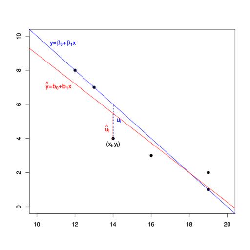 Keywords: SimpleLinearRegressionSketch2.svg en Shows a dataset and the true blue and estimated red regression line and for one observation x_i y_i hat y _i and the true residual U_i and the estimated residual hat u _i 2016-12-02 own Sigbert other versions cc-zero Scatterplots |