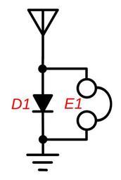 | Keywords: Simplest crystal radio circuit.svg Circuit of the simplest possible crystal radio receiver Circuits of this type were used in the first experimental crystal radio receivers in the pioneering days of radio just after 1900 It consists of a crystal detector semiconductor diode DI connected between a long wire antenna and ground with a sensitive earphone E1 attached across it The diode rectifies the radio signals picked up by the antenna by conducting the RF current moving in one direction to ground leaving a pulsing DC voltage across the detector This extracts the audio signal from the radio frequency carrier wave and the earphone converts the audio current to sound Since it lacks a tuned circuit or any other frequency-selective element besides the broad resonance of the antenna this circuit has no ability to select a single radio signal to receive out of all the signals picked up by the antenna so all radio stations picked up by the antenna are heard simultaneously in the earphone in practice the most powerful station usually drowns out the rest own 2010-05-18 Chetvorno I User Chetvorno release this work into the public domain for any use whatever Chetvorno Crystal radios |