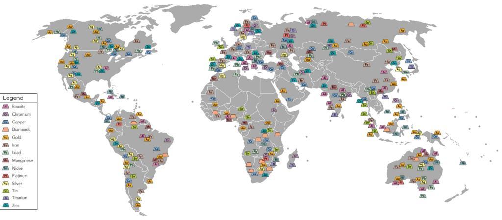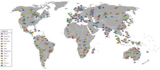 | Keywords: Simplified world mining map 2.png en A schematic showing the locations of certain ores deposits in the world A specific focus has been put on metals and construction materials Natural resources that are used for energy fossil oil gas can be found on another map Although metals can still be won from regular mining most metals can now be much more economically won from landfills This as landfills require much less labour less soil needs to be dug off and sieved In addition the use of a cradle-to-cradle material recovery can also save a lot of labour and is therefore also more economically attractive For some materials however regular mining will still need to continue In this case it is best to choose ore sites that are located in biodiversity-poor regions e g mountainous regions regions outside of the tropical-subtropical zone As the map is simplified we can herefore study the maps from the USGS at http //mrdata usgs gov/ ; the database is also usable with Google Earth see http //www gelib com/world-mineral-resources htm The map was made using data from Howstuffworks http //maps howstuffworks com/world-energy-minerals-map htm own KVDP 2009-01-21 Mining maps Natural resources |