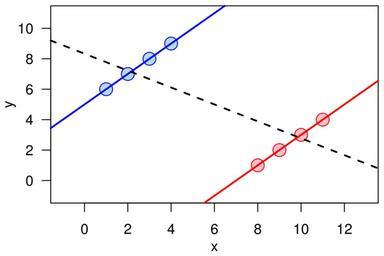 | Keywords: Simpson's paradox continuous.svg validSVG Illustration of the quantitative version of Simpson's paradox own 2007-06-14 Schutz Example of the quantitative version of w Simpson's paradox The graphic was created by User Schutz for Wikipedia on 14 June 2007 using the http //www r-project org/ R statistical project The program that generated and exported the graphic is given below; the uploaded version was generated slightly differently to workaround a bug during the PS to SVG conversion with <tt>pstoedit</tt> command The layout was slightly modified using Inkscape before upload <nowiki> x1 <- c 1 2 3 4 y1 <- x1 + 5 x2 <- x1 + 7 y2 <- x2 - 7 x <- c x1 x2 y <- c y1 y2 postscript simpson eps paper special width 4 5 height 3 par las 1 par mar c 3 3 0 5 0 5 par mgp c 2 1 0 plot x y cex 2 pch 21 col rep c blue red each 4 bg rep c lightblue pink each 4 xlim range x +c -2 2 ylim range y +c -2 2 abline lm y1 ~ x1 col blue lwd 2 abline lm y2 ~ x2 col red lwd 2 abline lm y ~ x lwd 2 lty 2 dev off </nowiki> Created with R Simpson's paradox Created with R |