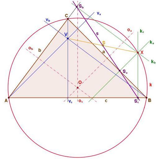 Keywords: Simson line.JPG en The circumcircle and the Simson line ΔABC a b c sides o<sub>a</sub> o<sub>b</sub> o<sub>c</sub> perpendicular bisectors O intersection of the perpendicular bisectors circumcenter X random circumcircle point k<sub>a</sub> k<sub>b</sub> k<sub>c</sub> perpendiculars to sides including the X point S<sub>a</sub> S<sub>b</sub> S<sub>c</sub> intersections of sides and k<sub>a</sub> k<sub>b</sub> k<sub>c</sub> perpendiculars s Simson line v<sub>a</sub> v<sub>b</sub> v<sub>c</sub> altitudes V orthocenter S center of the VX line segment cs Kružnice opsaná a Simsonova přímka ΔABC a b c strany o<sub>a</sub> o<sub>b</sub> o<sub>c</sub> - osy stran O průsečík os stran střed kružnice opsané X libovolný bod ležící na kružnici opsané k<sub>a</sub> k<sub>b</sub> k<sub>c</sub> kolmice na strany spuštěné z bodu X S<sub>a</sub> S<sub>b</sub> S<sub>c</sub> paty kolmic k<sub>a</sub> k<sub>b</sub> k<sub>c</sub> s Simsonova přímka v<sub>a</sub> v<sub>b</sub> v<sub>c</sub> výšky V průsečík výšek ortocentrum S střed úsečky VX own Lukas Sova 01/042009 SVG Simson line Triangle's circles Circumcircles of triangles |