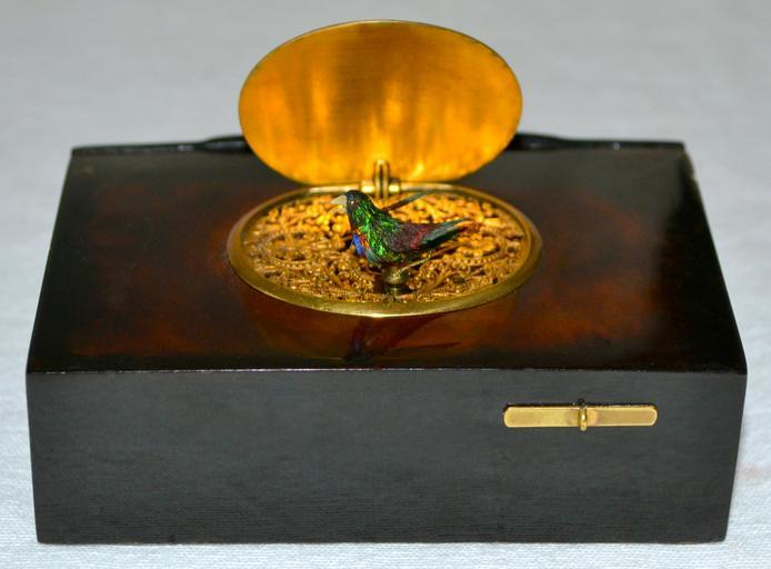 | Keywords: Singing Bird Box by Bontems.JPG en Singing bird box model nº 11 by the reputed French house Bontems circa 1890 Fitted with a going-barrel movement The beautiful and delicately crafted full-bodied bird with spiral legs exhibits multi-coloured layered feathered plumage with predominant tones of green and red complemented with also green red orange and blue iridescent hummingbird feathers giving as a result a well-combined palette of colours They were dressed by hand so no two birds look exactly alike The birds made by Bontems in this period are the most detailed and proportionate they ever made It goes up and down moving bone beak wings and tailfeather to continuous realistic birdsong rising through finely pierced and tooled gilt grille Plain polished silver gilt matt finished lid interior while the exterior shows a pair of hand-engraved birds foliage and floral decoration framed by a plain oval border in highly polished tortoiseshell case with a small hinged compartment to rear matching gilt start/stop button to front-right The top interior of the case has been shaved getting a semi-transparent look with a rich variety of tones and shades of honey brown and amber colours which allows to see part of the mechanism in action Measurements 10 cm by 6 70 cm by 3 10 cm Caja de pájaro cantor autómata modelo nº 11 fabricada por la firma francesa Bontems hacia el año 1890 El ave está vestida con plumaje de colibrí sudamericano con colores predominantes en verde y rojo complementados asimismo con verde rojo naranja amarillo y azul iridiscentes pico de hueso o marfil y patas de alambre en espiral Estos autómatas eran adornados a mano así que no hay dos que sean exactamente iguales Los pajarillos elaborados por Bontems durante esta época son de los más hermosos detallados y proporcionados que hicieron Mientras canta el ave autómata se mueve ligeramente de arriba a abajo abre y cierra el pico bate las alas y mueve la cola surgiendo a través de una rejilla finamente trabajada Caja con forma de tabaquera de auténtico carey pulido con pequeño compartimento en la parte trasera la cual muestra en su parte superior un medallón ovalado de plata dorada donde se representa una composición formada por una pareja de aves simbolizando la fidelidad y decoración vegetal a base de ramas con hojas y flores grabadas a mano todo ello enmarcado por un marco igualmente ovalado Palanca de mando de latón situada en la parte frontal derecha La parte superior interna de la caja ha sido rebajada en grosor lo cual permite apreciar toda una serie de matices y tonalidades en colores ámbar y marrón incluso puede observarse parte de la maquinaria en funcionamiento Teniendo en cuenta que el caparazón de tortuga difiere en cada ejemplar y que los artesanos trabajaban cada caja de manera individual dándole distintos acabados no hay dos que sean idénticas Medidas 10 cm de largo por 6 70 cm de ancho por 3 10 cm de alto own Jafd88 2012 Singing Bird Box Tortoiseshell Cc-zero |