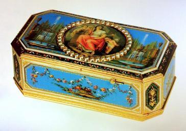 | Keywords: Singing bird box by Jaquet-Droz & Leschot, 1794.jpg en Singing bird box signed on the protection grille Jaquet-Droz Leschot of London although they were made in Switzerland The 18K gold case with chamfered corners is engraved enamelled and set with pearls was made by Jean-Georges Rémond and marked G R C for Georges Rémond Compagnie Genève Double body rectangular with canted corners the enamel lid painted with fountains in a classical landscape park against a periwinkle blue enamel ground and set with split-pearls on the border of the singing bird aperture side and base panels decorated with fruit flowal swags doves and musical trophies all against a periwinkle blue ground the canted corners and border of the lid with paillonné decoration over a black ground The oval lid painted with the Muse of Music flanked by two putti Singing bird movement Rectangular plates with canted corners and turned pillars fusee with chain circular bellow the bird with moving wings tail and beak controlled by a stack of 6 cams inertia wheel regulator Gilt brass engraved grille and outer gilt protection grille pierced and engraved with foliage Dim 87 x 45 mm Signed and dated on the bellows pumping plate Frisard à Bienne 1794 Jean-Georges Rémond Geneva goldsmith active from 1783 to 1815-20 Master goldsmith 22 December 1783 and struck his first Master mark Seven years later he appears to have formed a company Georges Rémond Cie which eventually became circa 1800 Rémond Mercier Lamy Cie During the French occupation of Switzerland by Napoléon J -G Rémond recorded marks which were in accordance with the laws of the newly formed Département of Léman i e his initials within a lozenge From 1815 to 1820 the firm Lamy Rémond Mercier Daniel Berton used a similar mark but no longer enclosed by a lozenge It seems that Rémond retired or died during this partnership since in 1820 a new firm of Mercier Blondel and Berton was formed However this new company only lasted a further seven years until 14 April 1827 own Jafd88 2013 Singing Bird Box Gold boxes Cc-zero |