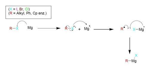 | Keywords: Single electron reduction.jpg en Formation of a Grignard-compound by single electron reduction nl Het algemene reactiemechanisme van de vorming van een organomagnesiumhalide Doormiddel van single electron reduction own Pyrobass 2011-08-18 Cc-zero Chemical reactions |