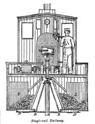 | Keywords: Single-rail Railway (front view) in Knight's American Mechanical Dictionary.gif de Single-rail Railway front view in Knight's American Mechanical Dictionary General LeRoy Stone's steam monorail was built at the Centennial Exposition marking the USA's 100th anniversary in 1876 It connected the Horticultural Hall with the Agricultural Hall via an elevated track extending about 155 m 170 yards and appears to have been called The Saddleback Railroad 1884 http //www aqpl43 dsl pipex com/MUSEUM/LOCOLOCO/centen/centen htm General LeRoy Stone's Centennial Monorail in The Museum of Retro Technology Knight's American Mechanical Dictionary Supplementary Volume 1884 other versions PD-old-70-1923 Uploaded with UploadWizard Centennial Monorail |