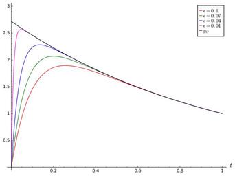 | Keywords: Singular perturbation convergence.svg singular perturbation solutions Shows solutions to <math> \epsilon y + 1+\epsilon y' + y 0 \ </math> with <math>y 0 0</math> <math>y 1 1</math> for varying <math>\epsilon</math> Created with the following Sage code <source lang python> var 't' var 'eps' y t exp -t - exp -t/eps / exp -1 - exp -1/eps yO t exp 1 - t combined plot y subs eps 0 1 t 0 1 color 'red' legend_label ' \epsilon 0 1 ' + plot y subs eps 0 07 t 0 1 color 'green' legend_label ' \epsilon 0 07 ' + plot y subs eps 0 04 t 0 1 color 'blue' legend_label ' \epsilon 0 04 ' + plot y subs eps 0 01 t 0 1 color 'magenta' legend_label ' \epsilon 0 01 ' + plot yO t 0 1 color 'black' legend_label ' y_O ' combined set_legend_options shadow False combined show ymax 3 axes_labels ' t ' </source> 2016-11-05 own Eviatar Bach other versions Created with Sage cc-zero Differential equations Asymptotics Images with Sage source code |
