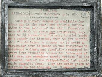 | Keywords: Sinhalese astrologic monthly calendar, A.D. 1800..JPG en Image of small box which contains a Sinhalese palm-leaf manuscript calendar ca 1800 from NLM ™s MS S1 section Pasted inside the box is a typewritten note describing its contents and identifying the donor Dr Casey Wood 1856-1942 of Chicago a prominent Canadian ophthalmologist and collector Dr Wood ™s introductory text gives a snapshot of activities and remedies best applied under a favorable horoscope 2013-08-21 12 42 01 Courtesy of the National Library of Medicine Images from the History of Medicine IHM http //ihm nlm nih gov/images/A109330 Also showcased in the book Hidden Treasure New York NY Blast Books 2012 p 63 Bethesda MD U S National Library of Medicine National Institutes of Health Health Human Services 2010 Custom license marker 2013 08 21 PD-USGov Uploaded with UploadWizard Medicine Traditional medicine Astrology Manuscripts Manuscripts medical Sinhala astrology |