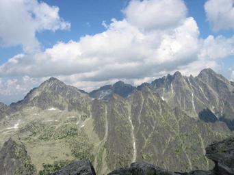 Keywords: Siroka veza - Lomnicky.JPG en From left Ladovy stit above Siroka veza hard to see Baranie rohy dark Pysny and Lomnicky stit Own Igi July/August 2008 View from Slavkovsky stit High Tatras Slovakia Baranie rohy