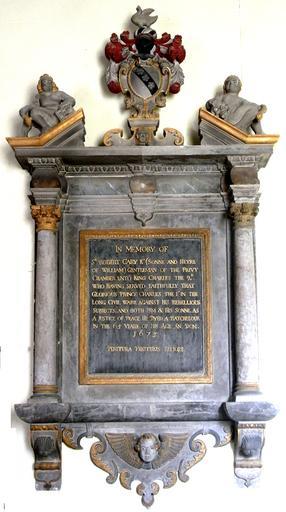 | Keywords: SirRobertCary Died1675 ClovellyChurch Devon.PNG en Mural monument to Sir Robert Cary 1610-1675 of Clovelly Devon All Saints Church Clovelly Inscription In memory of S<sup>r</sup> Robert Cary K<sup>t</sup> sonne and heyre of William Gentleman of the Privy Chamber unto King Charles the 2<sup>d</sup> who having served faithfully that glorious prince Charles the I<sup>st</sup> in the long Civil Warr against his rebellious subjects and both him and his sonne as a Justice of Peace he dyed a batchelour in the 65 yeare of his age An Dom 1675 Peritura Perituris Reliqui I have left behind those things destined to perish with those people destined to perish A reference to Seneca On Providence L ANNAEI SENECAE DIALOGORVM LIBER I AD LVCILIVM QVARE ALIQVA INCOMMODA BONIS VIRIS ACCIDANT CVM PROVIDENTIA SIT DE PROVIDENTIA V 7http //www thelatinlibrary com/sen/sen prov shtml Fata nos ducunt et quantum cuique temporis restat prima nascentium hora disposuit Causa pendet ex causa privata ac publica longus ordo rerum trahit ideo fortiter omne patiendum est quia non ut putamus incidunt cuncta sed veniunt Olim constitutum est quid gaudeas quid fleas et quamvis magna videatur varietate singulorum vita distingui summa in unum venit accipimus peritura perituri we receive what is perishable and shall ourselves perish literally we who are about to perish receive things about to perish ; We accept that we destined ourselves to perish live amongst things also destined to perish see works of Robert Leighton Archbishop of Glasgow Seneca's text translated as https //archive org/stream/moralessayswithe01seneuoft/moralessayswithe01seneuoft_djvu txt Therefore everything should be endured with fortitude since things do not as we suppose simply happen ” they all come Long ago it was determined what would make you rejoice what would make you weep and although the lives of individuals seem to be marked by great dissimilarity yet is the end one ” we receive what is perishable and shall ourselves perish Why therefore do we chafe why complain For this were we born Let Nature deal with matter which is her own as she pleases ; let us be cheerful and brave in the face of everything reflecting that it is nothing of our own that perishes Above are shown the arms of Cary Argent on a bend sable three roses of the field own photo Lobsterthermidor <span class signature-talk ></span> 14 18 10 February 2015 UTC 2014 All Saints Church Clovelly interior Wall mounted church monuments in Devon Cary arms |