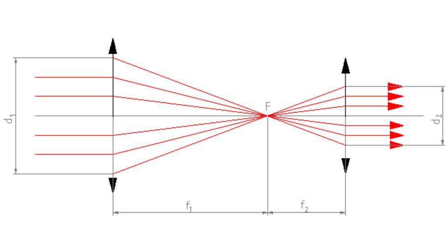 Keywords: Sistema afocale 1.png Schema di un concentratore di fascio costituito da un sistema afocale di due lenti Own 2007-08-31 Fornaeffe Focal length diagrams of positive lenses