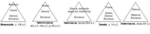 | Keywords: Sistemas políticos Grecia Antigua.JPG Grecia fue la civilización donde de manera más consciente los políticos se esforzaron por conseguir un gobierno justo y equitativo para todos los ciudadanos En concreto brilló por su genio político la polis o ciudad-Estado de Atenas En la imagen cronológicamente ordenadas la sucesión de regímenes de la ciudad-Estado de Atenas que llevaron desde una monarquía o diarquía sistema común en Oriente Próximo en el siglo VII antes de Cristo hasta la Constitución democrática de Clístenes 510-507 a C Entre Monarquía y Democracia los atenienses experimentaron la Aristocracia la Oligarquía o Timocracia de Solón y la Tiranía asociada en Atenas al nombre de Pisístrato y los Pisistrátidas Este vocabulario para designar regímenes políticos que proviene de la Antigua Civilización Griega pervive en la actualidad con casi los mismos significados 2006-12-26 own assumed Pistachoveloz derivative works Sistema politico grecia antica svg Constitutional law Democracy Cleisthenes economia |