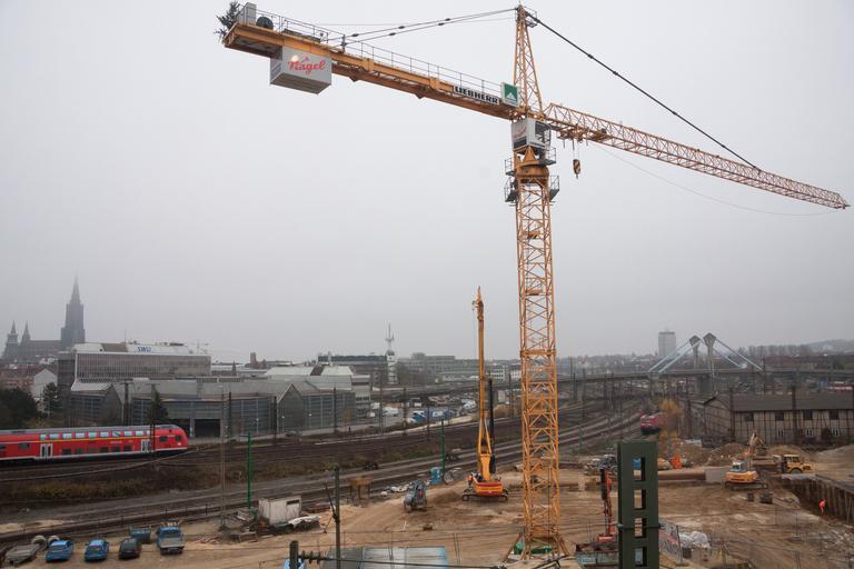 Keywords: site crane baukran construction work technology build metal construction machinery vehicles train trasse project stuttgart ulm fog