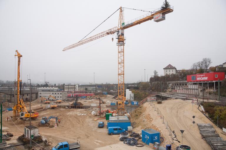 Keywords: site crane baukran construction work technology build metal construction machinery vehicles train trasse project stuttgart ulm fog