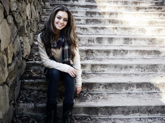 Keywords: sitting stairs girl woman smile happy scarf jeans stones wavy hair brown beautiful alone person