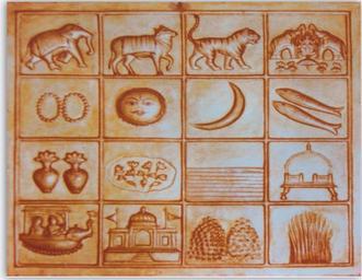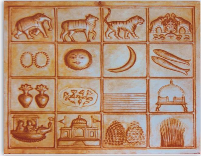Keywords: Sixteen Symbolic Dreams.jpg Uploaded with en wp UW marker 2012 09 10 Sixteen Symbolic Dreams I took this photograph 2005-01-05 Vaibhavsoni1 cc-zero Ajmer Jain Temple Interiors of Jain temples in India Jain symbols