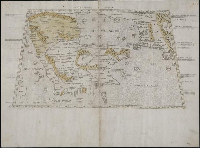| Keywords: Sixth Map of Asia - 1478.tif en Several editions of Ptolemy s Geographia Geography translated into Latin from the original Greek were published in Europe in the 15th century This map is from the 1478 edition which was published in Rome Ptolemaic atlases included 12 maps of Asia The Sixth Map of Asia covered the Arabian Peninsula The outlines of this map are crude but many geographic features including the Red Sea the Indian Ocean and different features of the peninsula are clearly recognizable fa از نسخه های نقشهٔ بطلمیوس، ترجمه شده به لاتین از نسخهٔ اصل یونانی منتشرشده در سدهٔ ۱۵ میلادی در اروپا رم شامل شبه جزیرهٔ عربستان، خلیج فارس، دریای سرخ اقیانوس هند و دیگر سرزمین های پیرامون ar إن العديد من طبعات جيوغرافيا الجغرافيا لبطليموس التي ترجمت من اليونانية الأصلية إلى اللاتينية، نُشرت في أوروبا في القرن الخامس عشر وقد وردت هذه الخريطة في طبعة ١٤٧٨،التي نشرت في روما وقد اشتملت أطالس بطليموس على ١٢خريطة لآسيا واشتملت خريطة آسيا السادسة على شبه الجزيرة العربية ورغم أن الخطوط العريضة لهذه الخريطة غير متقنة، فإن الكثير من المعالم الجغرافية، بما فيها البحر الأحمر، والمحيط الهندي، وملامح مختلفة من شبه الجزيرة يمكن التعرف عليها بوضوح es Varias ediciones de la Geographia Geografía de Ptolomeo traducidas al latín del griego original se publicaron en Europa en el siglo XV Este mapa pertenece a la edición de 1478 que se publicó en Roma Los atlas de Ptolomeo incluyen 12 mapas de Asia El Sexto mapa de Asia abarcaba la Península Arábiga Los contornos de este mapa son toscos pero muchos de los accidentes geográficos incluyendo el Mar Rojo el océano Índico y otros accidentes de la península son claramente reconocibles fr Plusieurs éditions de l'œuvre de la Geographia Géographie de Ptolémée traduites en latin à partir à partir de l'original grec ont été publiées en Europe au XVe siècle Cette carte provient de l'édition de 1478 publiée à Rome Les atlas ptolémaïques comprennent 12 cartes de l'Asie La Sixième carte de l'Asie couvrait la péninsule arabique Les contours de cette carte sont rudimentaires mais beaucoup d'éléments géographiques dont la mer Rouge l'océan Indien et d'autres caractéristiques de la péninsule sont clairement reconnaissables pt Geografia traduzida para o Latim do original Grego foi publicado na Europa no século XV Este mapa da edição 1478 a qual foi publicada em Roma Os atlas ptolemaicos incluem 12 mapas da Ásia O Sexto Mapa da Ásia cobre a Península Arábica As linhas deste mapa são toscas mas muitas características geográficas incluindo o Mar Vermeho o Oceano Índico e diferentes características da península podem ser claramente reconhecidas ru Геог афия Птолемея пе еведенных на латинский язык с г еческого о игинала были опубликованы в Ев опе в XV веке Данная ка та из издания 1478 года опубликованного в Риме Атласы Птолемея включают в себя 12 ка т Азии а Шестой ка те Азии изоб ажен весь А авийский полуост ов Общие конту ы на этой ка те весьма схематичны однако многие геог афические объекты в том числе К асное мо е Индийский океан и азличные геог афические особенности полуост ова четко узнаваемы zh-hans 几个版 的托勒密 理学指南 理学 , 从原希腊文翻译为拉丁文,并于 15 世纪 欧洲出版 这幅 图是 罗马出版的 1478 年的版 托勒密 图册包括 12 幅亚洲 图 亚洲第六幅 图 涵盖了阿拉伯半岛 图的轮廓比较粗糙,但众多 理特征包括红海 印度洋以及半岛的不同特点 十分清晰 1478 http //www wdl org/en/item/2702/ Institution Qatar Foundation Heritage Library Creator Ptolemy PD-old-100 Conrad Schweinheim Uploaded_with_UploadWizard Maps of Asia Maps showing history of Asia Ptolemaic middle east Images from the World Digital Library Qatar National Library Old maps of Saudi Arabia Maps of Midian Thamud Old maps of the Arabian Peninsula Theba Arabia Felix Hippos Port Thamyditae Thamydeni Oaditae Manitae Sidani Darte Cinedocloptas Zandma regio Apatei Ydeni Scenitae Saraceni |