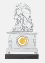 | Keywords: Sketch of a French Empire style clock. Rape of Europa.jpg en Watercolour gouache and pen and ink on laid paper Numbered 7 Dimensions 68 cm by 48 3 cm To be executed in alabaster; gilt bronze and enamel dial; black marble platform Europa with an arch of drapery over her head atop the Bull on the point of being borne out to sea and carried off to Crete In the Classical mythological tale of the Rape of Europa she was beguiled by the seemingly placid nature of Zeus Jupiter disguised as a white bull was abducted to Crete and ravished by the god who had by then resumed his normal form The bull whose form Zeus had taken became the zodiacal constellation Taurus The Europa myth had an obvious resonance in the Restoration period alluding to the pan-European disruption of the Napoleonic wars In addition the composition for the sculptural group on this clock is loosely based on the painting by Guido Reni looted from Rome by Napoleon and still in Paris at the Louvre for the first years of Louis XVIII ™s reign In view of Louis XVIII ™s antipathy to the Allies ™ intention in 1815 to recover the art works appropriated from other countries by Napoleon and to which he only consented in 1817 the modelling of a clock after a looted picture was a pointed political statement in support of the king http //watercolours-drawings com/details asp subGalID 5 index 19 author between 1815 1820 PD-Art French Empire style mantel clock Sketches Europa mythology |