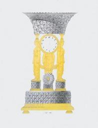 | Keywords: Sketch of a French Empire style clock. The Three Graces.jpg en Watercolour gouache and pen and ink on laid paper Numbered 11 Dimensions 92 8 cm by 50 8 cm To be executed in gilt bronze mounted cut crystal; enamel dial Surmounted by a crystal vase of basket form cut with hobnails in a trellis pattern supported by three female caryatids holding floral swags standing on individual crystal socles decorated en suite the clock dial within bound oakleaf bezel resting on two of their shoulders the whorled pendulum bob also of crystal; on similarly cut crystal cylindrical plinth on beaded feet The Three Graces were the personification of grace and beauty often represented as the handmaidens of Venus sharing several of her attributes including the rose which could be arranged here in the glass bowl According to Hesiod their names were Aglaia Euphrosyne and Thalia Seneca described them as standing for the threefold aspect of generosity giving receiving and reciprocating; the Renaissance saw them as the three phases of love beauty arousing desire leading to fulfilment or as personification of Chastity Beauty and Love Here such evocations of Love may be taken to symbolise the bond between king and people the caryatid figures supporting the cup of the nation overflowing with the flowers with which it is meant to be filled This design may be a development of the Three Graces centerpiece forming part of a sourtout de table exhibited by Gérard-Jean Galle at the 1819 Paris exhibition http //watercolours-drawings com/details asp subGalID 5 index 25 author circa 1820 PD-Art French Empire style mantel clock Sketches |