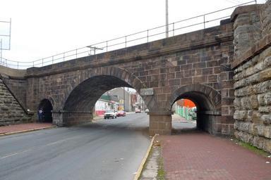 | Keywords: Skew Bridge.JPG 73001590 Reading Pennsylvania According to the PHMC state historical marker not visible it was designed by Richard Osborne in 1857 for the P R Reading Railroad Each course of the 40 foot arch is ellipsoidal and the stones are properly curved to accommodate the skew There is no keystone own Smallbones 2011-03-29 40 20 37 N 75 55 34 W Cc-zero National Register of Historic Places in Berks County Pennsylvania Reading Railroad bridges Bridges on the National Register of Historic Places in Pennsylvania Stone arch railway bridges in Pennsylvania Buildings and structures in Reading Pennsylvania Bridges in Berks County Pennsylvania Skew arch bridges |