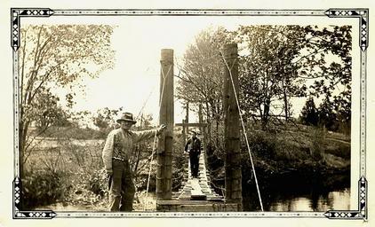 | Keywords: skootamatta river skootamattariver skoot river skootriver foot bridge footbridge swing bridge swingbridge flinton lessard photo border outdoor Caption on photo reads: 'Grandfather Lessard & Elwin [Lessard] at Swing Bridge'. There is also a notation stating the man on the bridge is carrying a 'beer box'. This 'beer box' may have been a local joke, since beer did not come commercially in that type of container until the 1990s. This photo was taken in the mid 1900s, probably circa 1935. The bridge spans the Skootamatta River west of the Hamlet of Flinton. Part of the Carol Lessard Collection. Note: All CDHS Flickr content is available for the public use (non-commercial) providing our Rights Statement is followed: pioneer.mazinaw.on.ca/flickr_statement.php Caption on photo reads: 'Grandfather Lessard & Elwin [Lessard] at Swing Bridge'. There is also a notation stating the man on the bridge is carrying a 'beer box'. This 'beer box' may have been a local joke, since beer did not come commercially in that type of container until the 1990s. This photo was taken in the mid 1900s, probably circa 1935. The bridge spans the Skootamatta River west of the Hamlet of Flinton. Part of the Carol Lessard Collection. Note: All CDHS Flickr content is available for the public use (non-commercial) providing our Rights Statement is followed: pioneer.mazinaw.on.ca/flickr_statement.php |