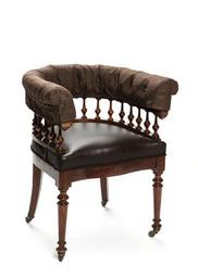 | Keywords: Skrivstol, 1844 - Hallwylska museet - 108455.tif LSH artwork A Fredrik Malmquist snickare sv Med fyra ben sarg armstöd och rygg Främre benen svarvade profilerade samt avsmalnande nedåt de bakre fyrsidiga svagt utsvängda samt avsmalnande nedåt under varje ben en trissa av horn rörlig i en svängbar mässingsgaffel Sargen med raka sidosidor svagt vågig fram- och starkt bågformig baksida överkant och underkant raka Sits med stoppning liggande på en flätning av breda sadelgjordar fästa i sargen samt klädd med rödbrunt skinn Armstöd och rygg utgörs av ett på bak- och sidosidor liggande räcke i form av en barriär med svarvade balustrar nedre ändarna fästa i ett på bredsidan liggande tunt understycke övre ändarna i en hög överliggare med starkt utsvängd överkant i form av en vulst; överliggaren stoppad och klädd med skinn som sitsen; längs insidan en rad häftningar med en överklädd knapp i varje Nedtill kring sitsen på utsidan samt nedtill kring överliggaren på båda sidor en snodd av brunt yllegarn Tillhört inventarierna på firman Wilh H Kempes innehavare Walther von Hallwyl och Johanna Kempe f Wallis kontor inrymt i Blasieholmstorg 11 1884 - 30 September 1896 och Hamngatan 4 1 Oktober 1896 - 1909; sedermera på Walther von Hallwyls privata kontor 1909 - 1921 samt slutligen på Wilhelmina von Hallwyls f Kempe kontor där från sistnämnda år t o m 1930 original caption Skrivstol 1844 1884 brass - hide - mahogany - horn size cm 80 size cm 55 sits size cm 54 sits size cm 52 sits HWY place of origin Stockholm SE original filename hm_dig22127 19226 inventory number HWY IIlVA f 01 108455 CC-BY-SA Jens Mohr Armchairs Furniture in the Hallwyl museum Office furniture Jens Mohr Media contributed by LSH dim-with multiple size templates Media contributed by LSH unmatched creator Media contributed by LSH 2016-05 1880s furniture 1884 Offices in the 1880s |