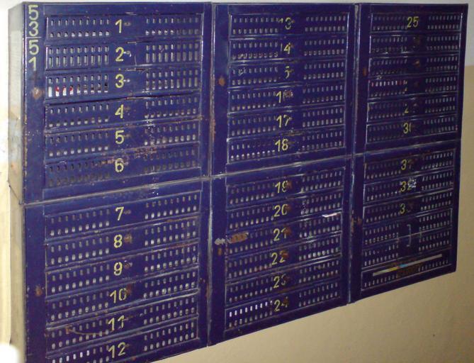 Keywords: Skrzynka.oddawcza33.JPG en Old-style letter box for 33-apartments building in Poland ru Абонентский почтовый ящик ста ого типа для 33-ква ти ного дома в Польше Own 2007-08-16 Julo Julo Letter boxes in Poland Blue objects