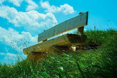 Keywords: sky bank clouds nature green resting place sit bench break meadow