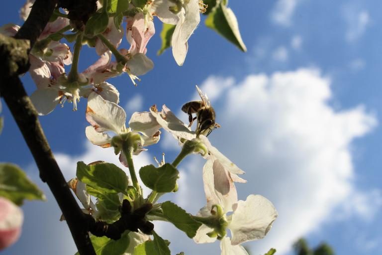 Keywords: sky bee honey flower nature spring blossom insect green fly outdoors blue single natural macro summer color tree leaf petal honeybee pollen healthy meadow rural season field agriculture leaves flora colorful countryside