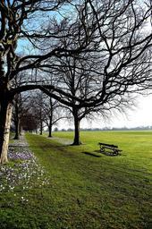 Keywords: sky blue cloud clouds white flowers background branch tree bench park sitting relaxation landscape grass green sun