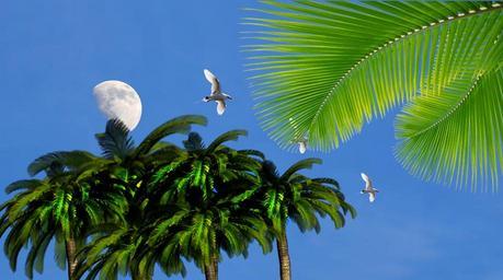 Keywords: sky blue sky tree nature moon astro natural satellite coconut tree leaves vegetation tropical plant environment flying seagulls tropical birds green landscape bird