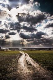 Keywords: sky clouds dirt road pathway path field nature environment cloudscape weather fluffy bright
