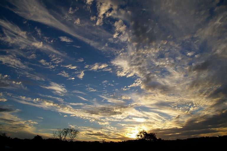 Keywords: sky clouds sunset rays blue grey white horizon trees australia