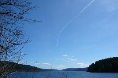 Keywords: sky contrail clouds blue clear sunny water bank aircraft forest aesthetic tree light nature lake horizon