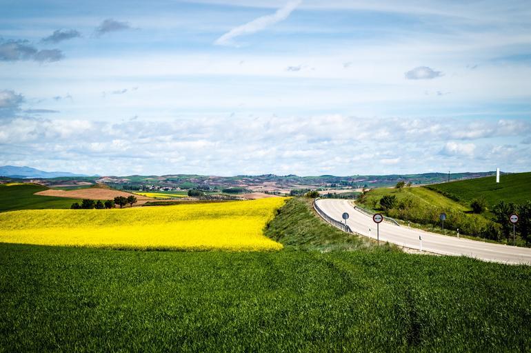 Keywords: sky field blue sky clouds landscape cultivation agriculture spring road