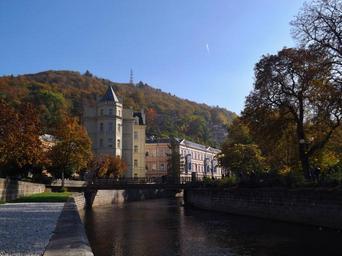 Keywords: sky karlovy vary river houses landscape trip city river bank