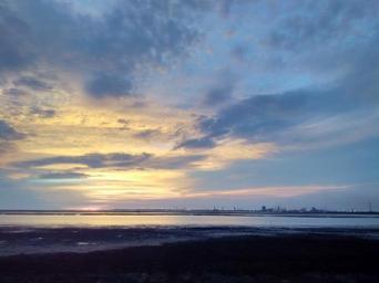 Keywords: sky sunset blue nature landscape sunlight light orange horizon bright clouds scene outdoor sun sunrise season natural weather cloudscape travel view yellow evening water