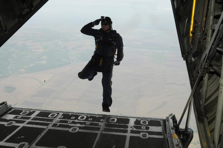 Keywords: skydiving jump falling parachuting military training high people parachute flight sky airplane navy leap frogs seals team stunts free fall