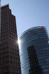 Keywords: skyscraper architecture modern city silhouette commercial building building office building complex berlin mirroring potsdam place germany window facade sun sunlight shadow sky back light capital
