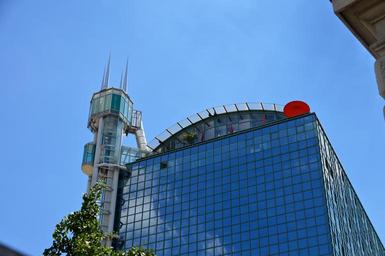 Keywords: skyscraper elevator city hotel tower pointed sky blue kempten bavaria architecture glass front tower house glass mirroring cloud town home roofs downtown urban planning live and work