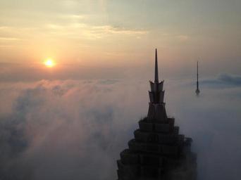 Keywords: skyscrapers tips antennas building architecture sky above clouds peaking sun high tall tower structure construction exterior freedom