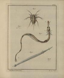 | Keywords: Slabber plate 06.jpg nl <br/> 1 De zee-watervloo wapendrager Armiger later herkend door van Benthem Jutting 1970 als de larve van een zeepok Balanus balanoides synoniem van Semibalanus balanoides 2 - 3 Het naald-vischje opblazer Inflator later herkend door van Benthem Jutting 1970 als de grote zeenaald Syngnathus acus 4 - 5 De zee-worm pijl Sagitta later herkend door van Benthem Jutting 1970 als een pijlwormsoort Sagitta setosa en species as recognized by World Register of Marine Species 1 Balanus balanoides accepted as Semibalanus balanoides Linnaeus 1758 2 - 3 Syngnathus acus Linnaeus 1758 4 - 5 Sagitta setosa J Müller 1847 accepted as Parasagitta setosa Müller 1847 Slabber 1778 pl 06 scan provided by World Register of Marine Species P M Brasser in Slabber M 1778 1778 PD-old-100 Semibalanus balanoides Syngnathus acus Parasagitta setosa |