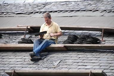 Keywords: Slater at work, Rothesay, Isle of Bute.jpg A slater working on the roof of a house in Bishop Terrace Rothesay Isle of Bute Own 2007-06-20 Karora Personality rights Slate roofs Men at work Roof repairs Rothesay Bute Roofing tools