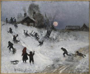 | Keywords: Sledging (Bruno Liljefors) - Nationalmuseum - 23553.tif Artwork Creator Bruno Liljefors Sledging Winter scenes are central to Bruno Liljefors ™ imagery Snow-covered landscapes with birds foxes or lone hunters recur in many variations throughout his oeuvre His poi-gnant studies of the changing seasons had a very specific objective “ to portray with great realism the interplay between animals and their natural habitats A more unusual subject in Liljefors ™ production is the painting Sledging from 1882 Here instead of wild animals children are playing in the snowy setting Vintermotiven spelar en stor roll i Bruno Liljefors bildvärld Snötäckta landskap med fÃ¥glar rävar eller ensamma jägare Ã¥terkommer i olika varianter genom hela hans konstnärskap Hans känsliga studier av Ã¥rstidernas växlingar hade ett alldeles särskilt syfte “ att med största realism skildra djurens samspel med sin naturliga miljö Mer ovanlig i Liljefors produktion är mÃ¥lningen KälkbacksÃ¥kning frÃ¥n 1882 Här är det för ovanlighetens skull lekande barn och inte vilda djur som uppfyller snölandskapet header Winter scenes are central to Bruno Liljefors ™ imagery Snow-covered landscapes with birds foxes or lone hunters recur in many variations throughout his oeuvre His poi-gnant studies of the changing seasons had a very specific objective “ to portray with great realism the interplay between animals and their natural habitats A more unusual subject in Liljefors ™ production is the painting Sledging from 1882 Here instead of wild animals children are playing in the snowy setting Vintermotiven spelar en stor roll i Bruno Liljefors bildvärld Snötäckta landskap med fÃ¥glar rävar eller ensamma jägare Ã¥terkommer i olika varianter genom hela hans konstnärskap Hans känsliga studier av Ã¥rstidernas växlingar hade ett alldeles särskilt syfte “ att med största realism skildra djurens samspel med sin naturliga miljö Mer ovanlig i Liljefors produktion är mÃ¥lningen KälkbacksÃ¥kning frÃ¥n 1882 Här är det för ovanlighetens skull lekande barn och inte vilda djur som uppfyller snölandskapet 1882 Oil on canvas Olja pÃ¥ duk Size cm 61 50 Framed Size cm 80 5 69 5 5 5 Institution Nationalmuseum Stockholm Signerad Bruno Liljefors -82 accession number 23553 NM 6504 place of creation Nationalmuseum Nationalmuseum Stockholm cooperation project Licensed-PD-Art PD-old-auto PD-Nationalmuseum_Stockholm 1939 Media contributed by Nationalmuseum Stockholm 2016-10 Paintings in the Nationalmuseum Stockholm Bruno Liljefors |