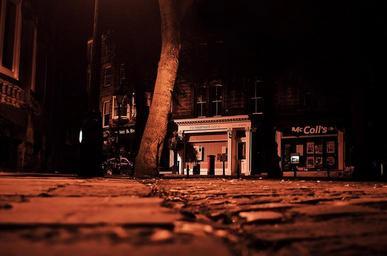 Keywords: sleeping city sleep night evening dark architecture lamps lighting eerie empty soma sidewalks stores closed town background england harrogate