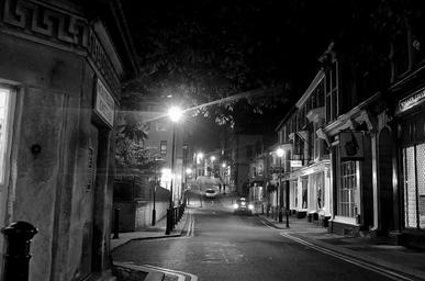 Keywords: sleeping city sleep night evening dark architecture lamps lighting eerie empty soma sidewalks stores closed town background england harrogate