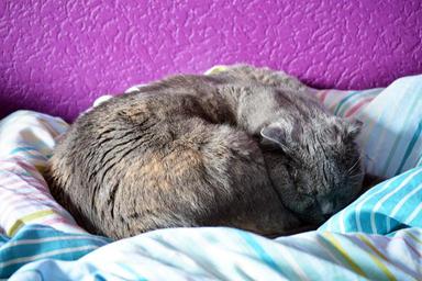Keywords: sleepy cat cuddling domestic cute relax curled home bed blanket purple blue grey gray white scottish fold dream animal pet fat big adorable fur comfort comfortable cozy tranquil asleep sleeping peaceful lying